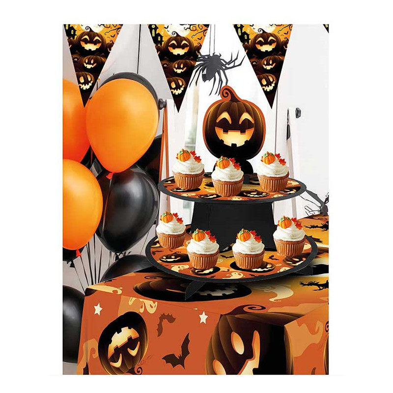 Le plateau citrouille à étages est idéal pour décorer une table d'Halloween. Il sera aussi très pratique pour poser des mignardises, des muffins ou des amuse-bouches. Sur notre site, ce plateau est aussi proposé avec des illustrations de clowns tueurs.