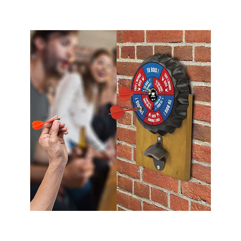 Le jeu à boire fléchettes apéro contient une planche en bois sur laquelle est fixé un décapsuleur en métal et la cible, ainsi que 6 fléchettes aimantées. Ce jeu mesure 27 cm de hauteur, 18 cm de largeur et possède une attache pour que vous puissiez l'accrocher facilement. Cette cible de fléchettes en forme de capsule mesure 18 cm de diamètre, elle possède de nombreuses cases comme "Tu bois !", "Tu fais boire et relance !", "Cul-sec pour tout l'monde sauf toi"...