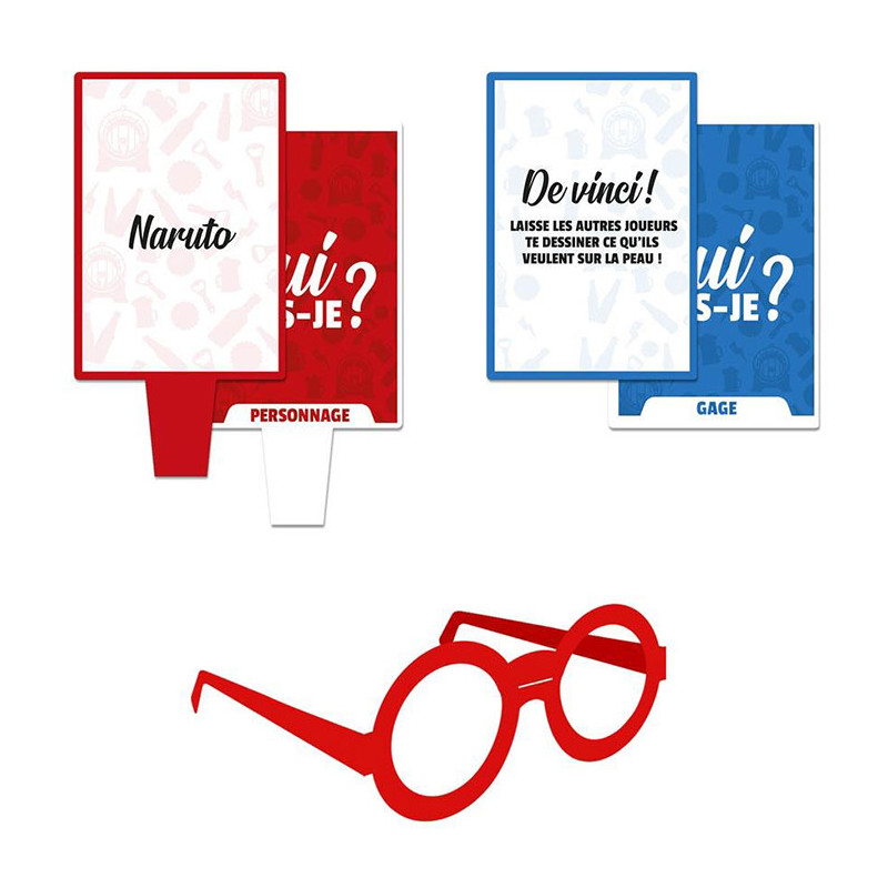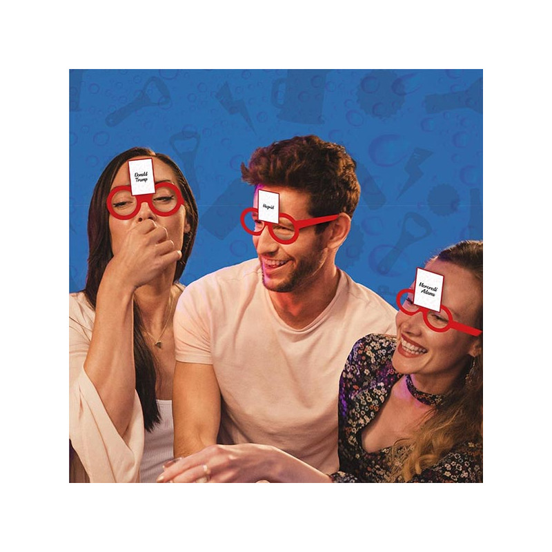 Inclus : 4 paires de lunettes en carton, 20 cartes personnages, 20 cartes gages
