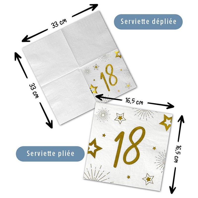 Inclus : 16 Serviettes en papier Anniversaire 18 ans blanc/or 16,5x16,5cm