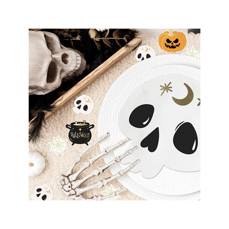 Pour avoir une table assortie à ces serviettes tête de mort, nous proposons de nombreux accessoires décoratifs comme des confettis de table, des pots à bonbons, des centres de table, des pics à mettre sur les amuse-bouches, des pailles en carton ou encore des étiquettes à coller sur les bouteilles.