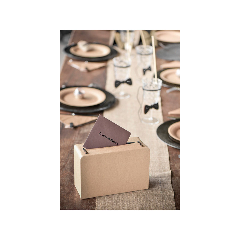 Pour accompagner cette cagnotte valise couleur kraft, nous avons un beau livre d'or assorti pour que chaque invité puisse laisser un petit message. Si vous souhaitez avoir une table avec la même couleur, vous trouverez sur notre site des assiettes compostables couleur kraft, des serviettes Airlaid, des gobelets ainsi que des marque-places.