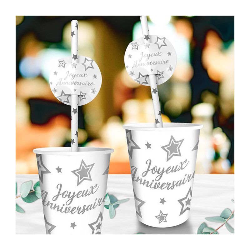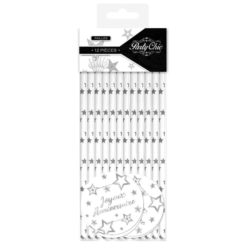 Inclus : 12 pailles anniversaire en carton blanc/argent de 20 cm